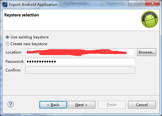 2、創(chuàng)建秘鑰keystore,輸入密碼,密碼一定要記住啊,下次使用Use existing keystore會(huì)用到,以后生成apk都用這個(gè)秘鑰和密碼。